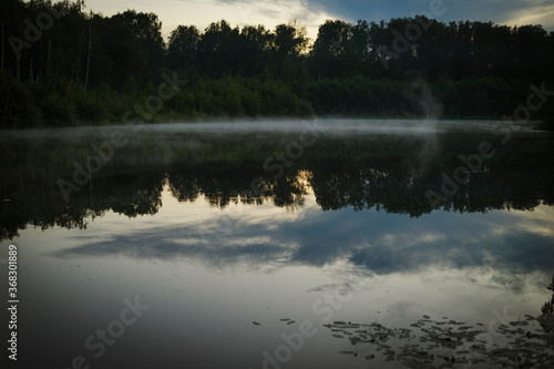 © Nataliya Westphal, Fototapeta premium sunset over the lake in forest with fog
