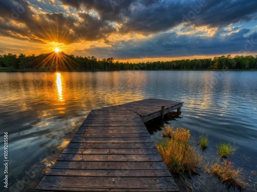 © Younes, Naklejka premium Sunset over the Lake Pier