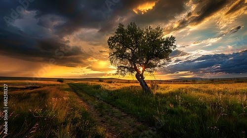 © Arbystudio, Obraz premium Sunset over the lonely tree in the middle of the vast prairie field