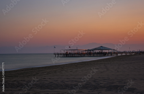 Fototapeta premium Sunset over the massive concrete pier leading to horizon surrounded by Mediterranean sea. Long exposure shot made in Belek, Turkey. August 2020