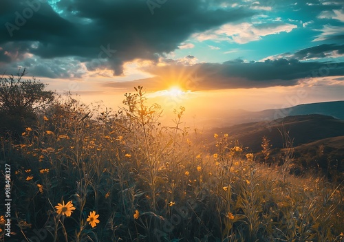© Adobe Contributor, Fototapeta premium Sunset Over the Meadow with Flowers