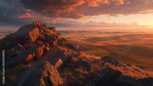 © Whale Studio, Obraz premium sunset over the mountains,panorama landscape with sun and rocky and desert at sunrise or sunset,for banner wallpaper cover poster,backdrop design with copy space