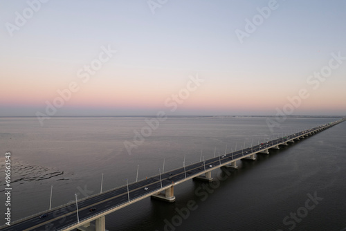 Fototapeta premium sunset over the ocean and second longest in europe bridge with cars driving...
