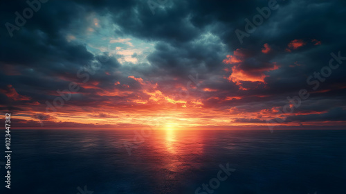 Naklejka premium Sunset Over the Ocean - Dramatic Sky, Orange and Blue Clouds, Calm Water