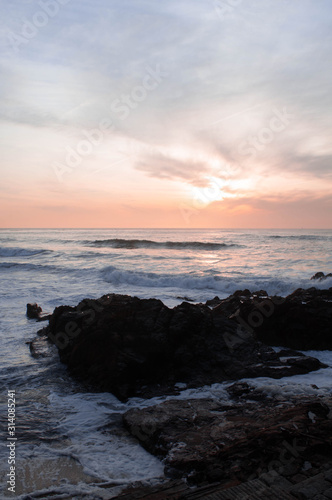 Fototapeta premium Sunset over the ocean, waves break down to rocks in the water