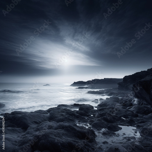 © Epik Stock, Obraz premium sunset over the ocean with dusk horizon in black and white shoot