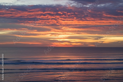 © Sergiu, Obraz premium Sunset over the ocean with waves and a dramatic sky
