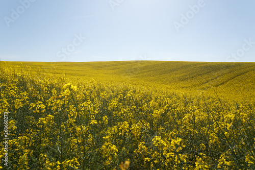 Fototapeta premium Sunset over the rapeseed field among the hills