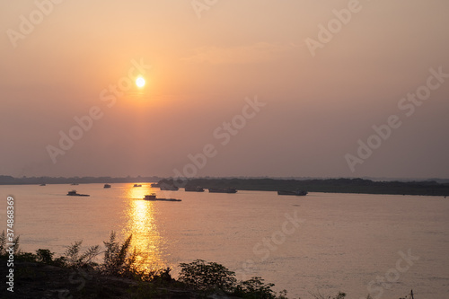 © MeiLou, Naklejka premium Sunset over the red river with boats in hanoi