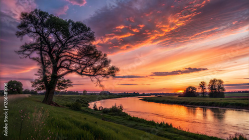 © CreativeAIDesigner, Obraz premium sunset over the river