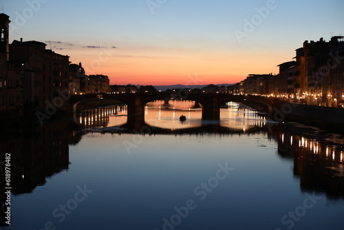 Naklejka premium Sunset over the River Arno in the summer. Beautiful Ponte Vecchio city. Night...