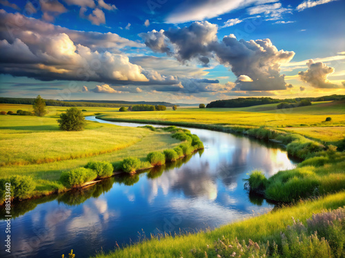 Obraz premium sunset over the river, nature, sky, lake, river, grass, summer, green, meadow, cloud, reflection, clouds, forest, field, tree, view