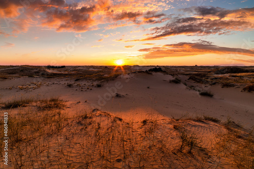 © Anton Petrus, Naklejka premium Sunset over the sand dunes in the desert. Arid landscape of the Sahara desert