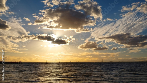 © Dmsyys, Obraz premium Sunset over the sea at Brighton Beach in Melbourne, Australia.
