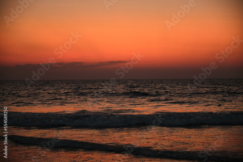 Fototapeta premium Sunset over the sea, waves and silhouettes.