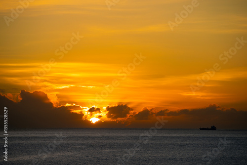 © bluejeansw, Naklejka premium Sunset over the sea with a ship in the distance. Colorful sunset over the sea.