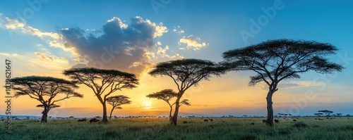 Obraz premium Sunset Over the Serengeti in Tanzania with Acacia Trees Silhouetted Against a Vibrant Sky and Grazing Wildlife