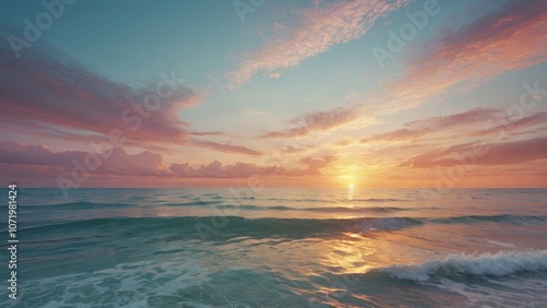 Fototapeta premium Sunset over the tranquil ocean waves reflecting vibrant colors at the beach during early evening hours