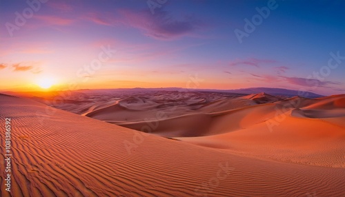 © arbi wiratama, Naklejka premium Sunset Over the Vast Desert With Rolling Sand Dunes Glowing Golden Under the Fading Light, While the Sky Transitions From Orange to Deep Purple in the Distance