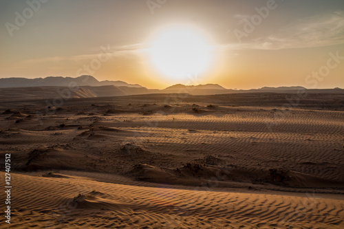 © louiserussell77, Fototapeta premium Sunset over the Wahiba Sands desert, Oman.