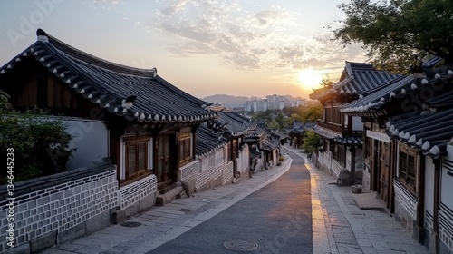 Fototapeta premium Sunset over traditional hanok village bukchon south korea photography serene atmosphere scenic view