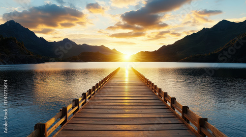 © siraphol, Fototapeta premium Sunset over tranquil lake with wooden pier extending into water, creating serene atmosphere