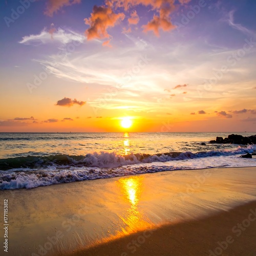 Fototapeta premium Sunset over tranquil ocean at beach, reflecting colors