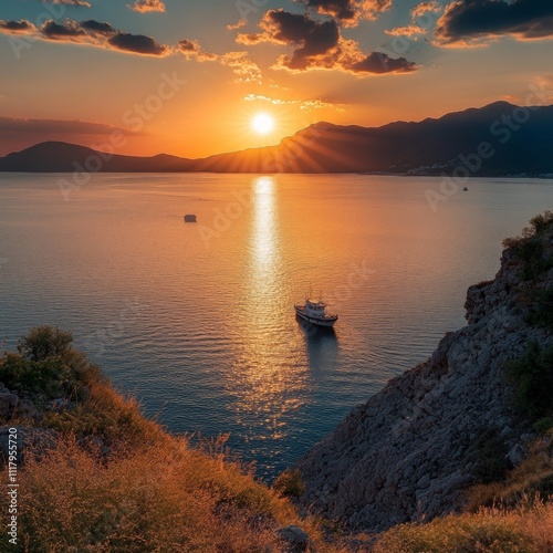 © Autchara, Naklejka premium Sunset Over Tranquil Water with Silhouetted Hills