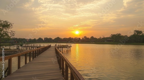© Nuttaya Nampai, Fototapeta premium Sunset Over Tranquil Water with Wooden Walkway
