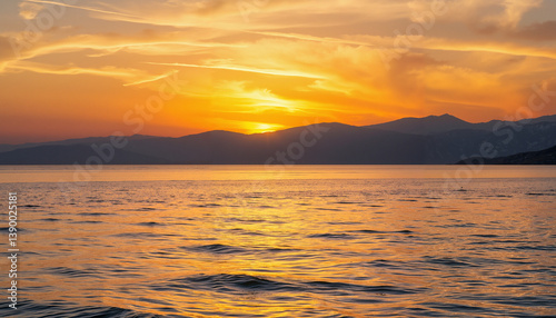 © Katerina Polibina, Fototapeta premium Sunset over tranquil waters with distant mountains