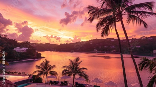 © Alleuy, Fototapeta premium Sunset over tropical bay resort view