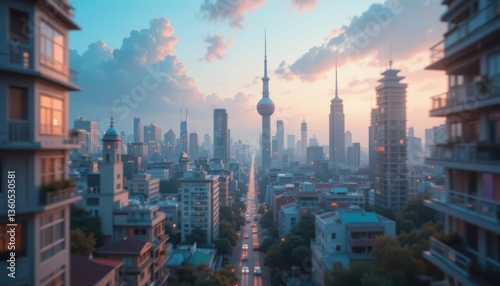 Obraz premium Sunset Over Urban Skyline with Skyscrapers and City Landscape