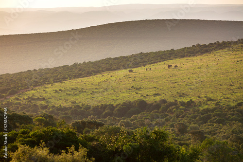 © Haico, Obraz premium Sunset over valley with herde of elephants in Addo Elephant Park, South Africa