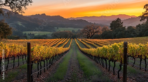 © aqiio, Obraz premium Sunset over vineyard rows in valley.