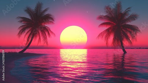 © Dawna, Naklejka premium Sunset over water with palm trees reflecting in the ocean pink and yellow.
