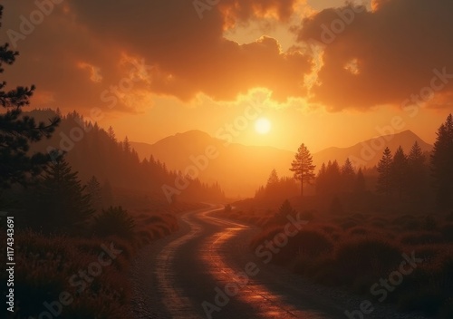 © puruan, Obraz premium Sunset over winding river in serene forest landscape with dramatic clouds