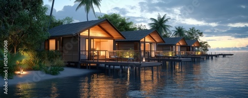 Obraz premium Sunset overwater bungalows surrounded by tropical lush trees and tranquil ocean