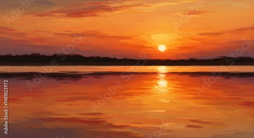 Fototapeta premium Sunset Painting Reflecting Over Still Water with Orange Sky