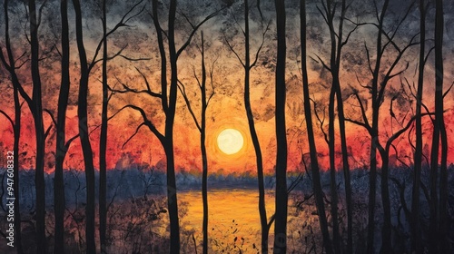 © Aliando, Obraz premium Sunset Painting with Trees