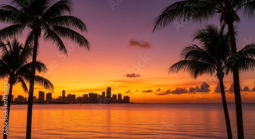 © Terri, Obraz premium Sunset paints a vivid sky above a city skyline across calm water with dark palm tree silhouettes framing the colorful horizon of purple orange and yellow