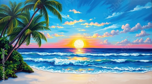 Fototapeta premium Sunset paints the sky ablaze as a lone palm tree sways on a pristine tropical...