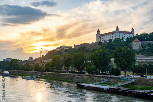 Obraz premium Sunset panorama of Bratislava Grad and downtown over Donau river, Slovakia...