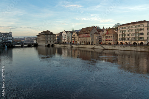 Naklejka premium Sunset panorama of city of Zurich and reflection in Limmat River, Switzerland