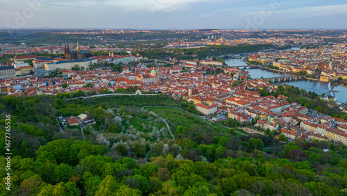 © dudlajzov, Fototapeta premium Sunset panorama view of Hradcany from Petrin hill in Prague, Cze