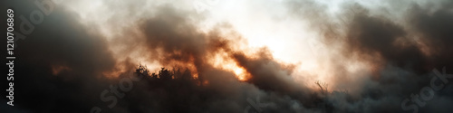 © Lila Patel, Fototapeta premium Sunset Partially Obscured by Smoke and Silhouetted Trees