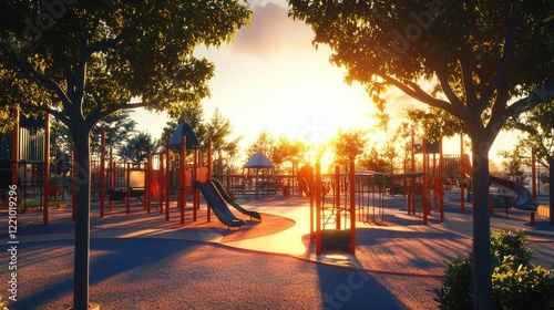 © Berkah1789, Obraz premium Sunset Playground Scene with Colorful Play Structures and Trees