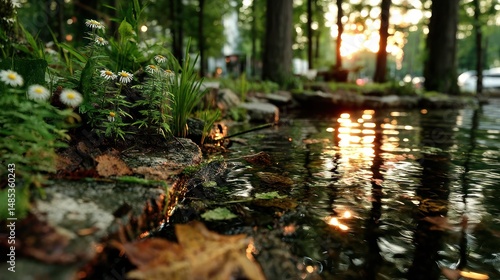 Naklejka premium Sunset pond in park
