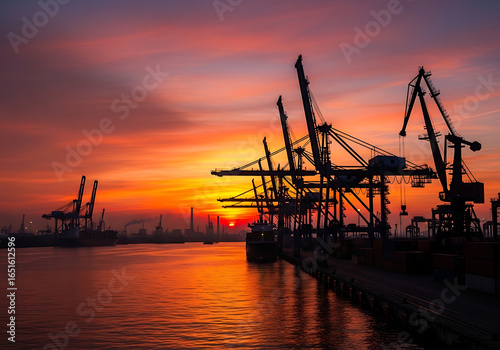 © Nasar, Obraz premium Sunset Port Cranes Cargo Shipping Industry