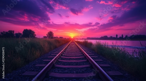 Obraz premium Sunset railroad tracks by river