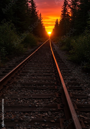 © NguyenHaiPhuong, Fototapeta premium Sunset Railroad Tracks Warm Light. AI Generated